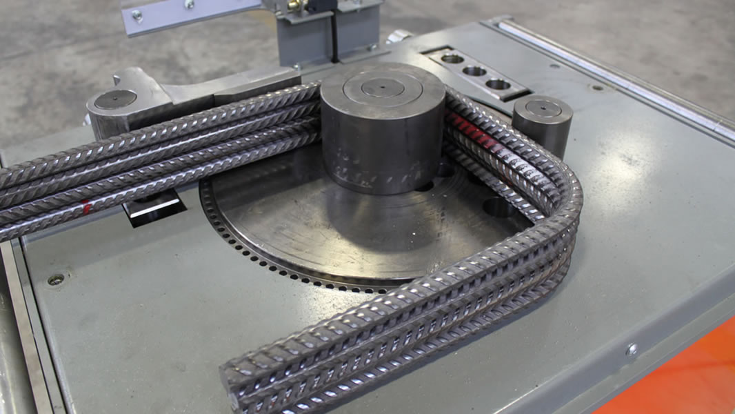 Maquina dobladora para la elaboración del hierro en barras. Disco de doblado y guías de deslizamiento ajustables en acero a alta resistencia.