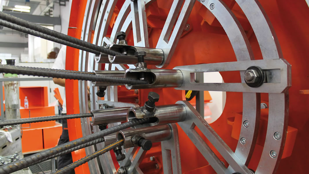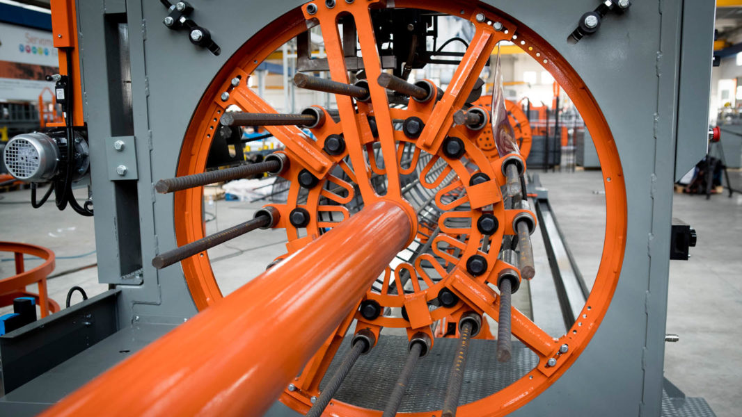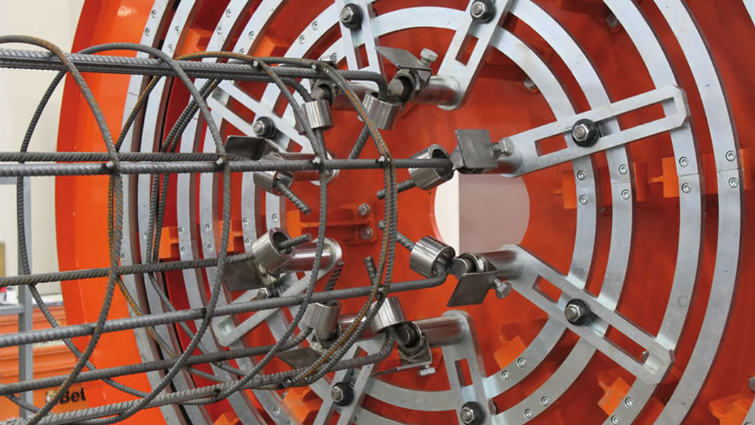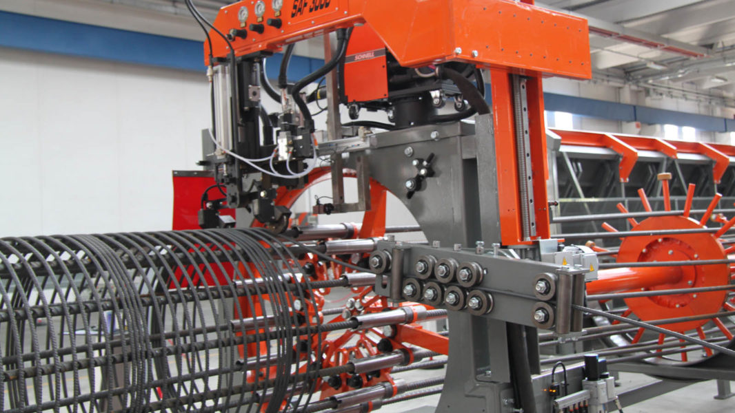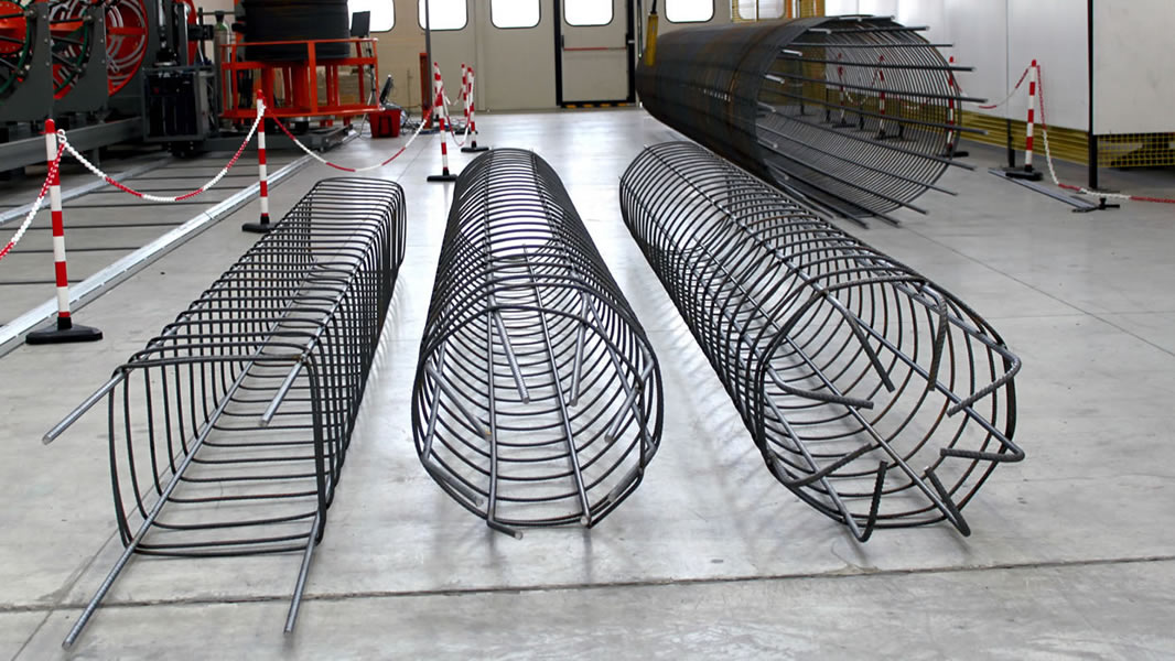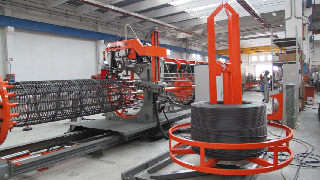 Pilotera para la producción de pilotes cilíndricos con espiral soldada y paso programable; máxima jaula realizable: Ø 1100 mm.