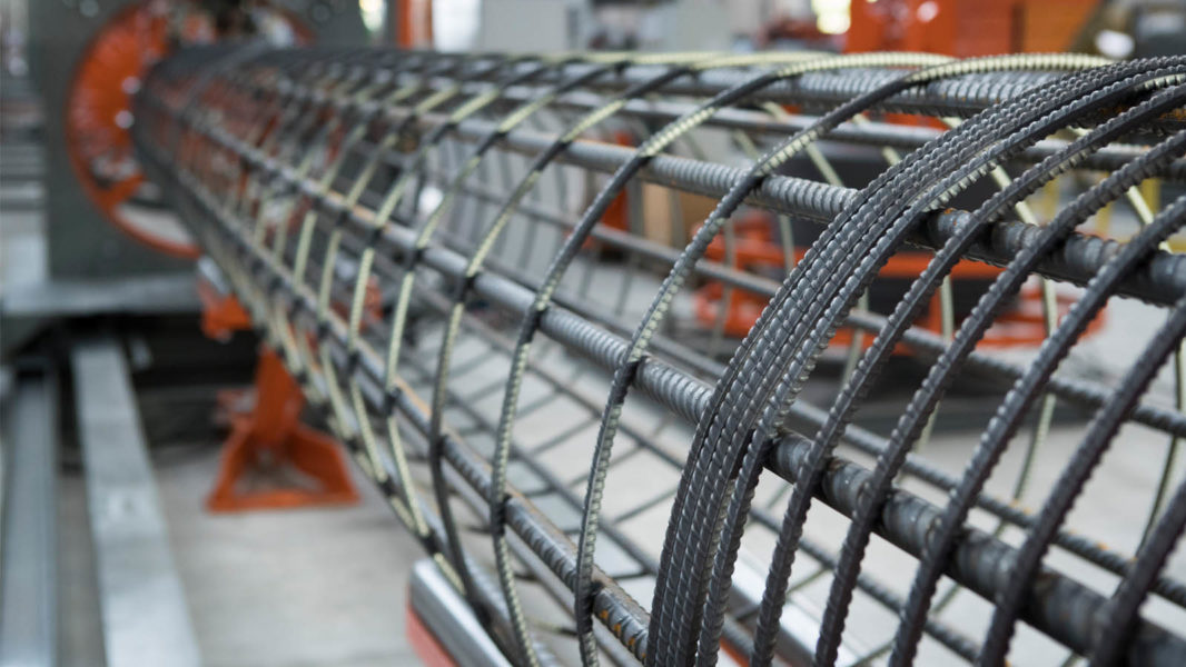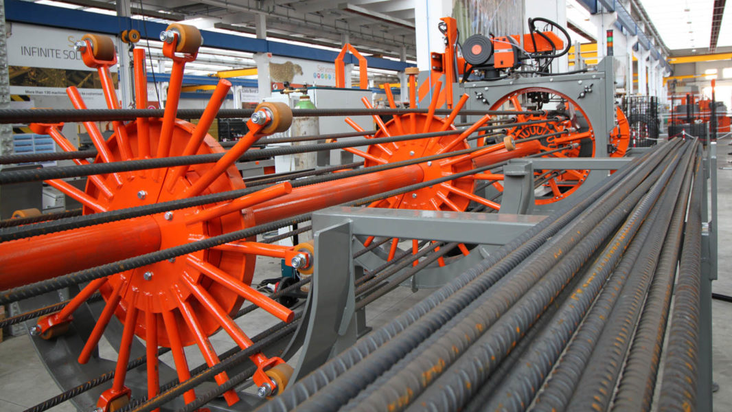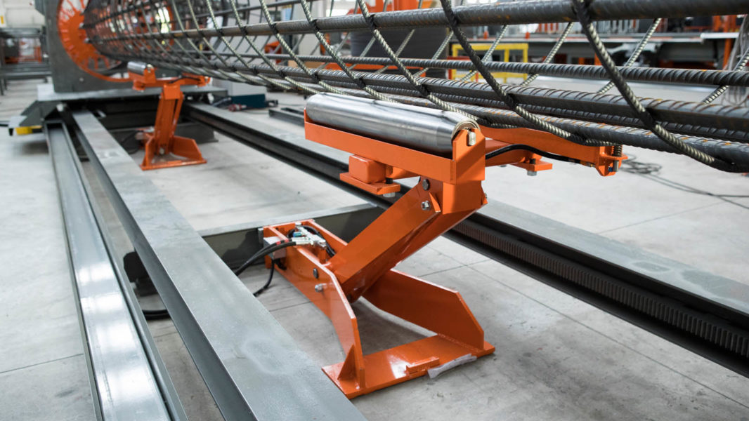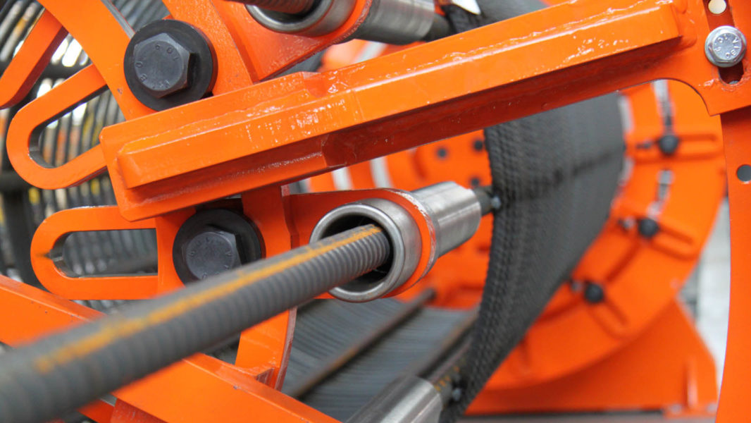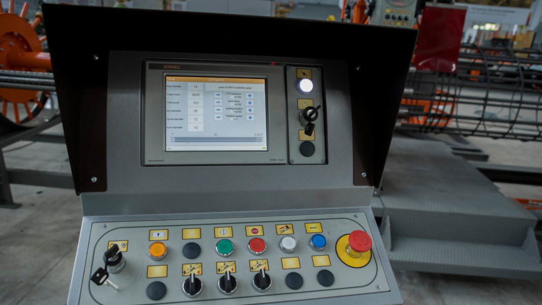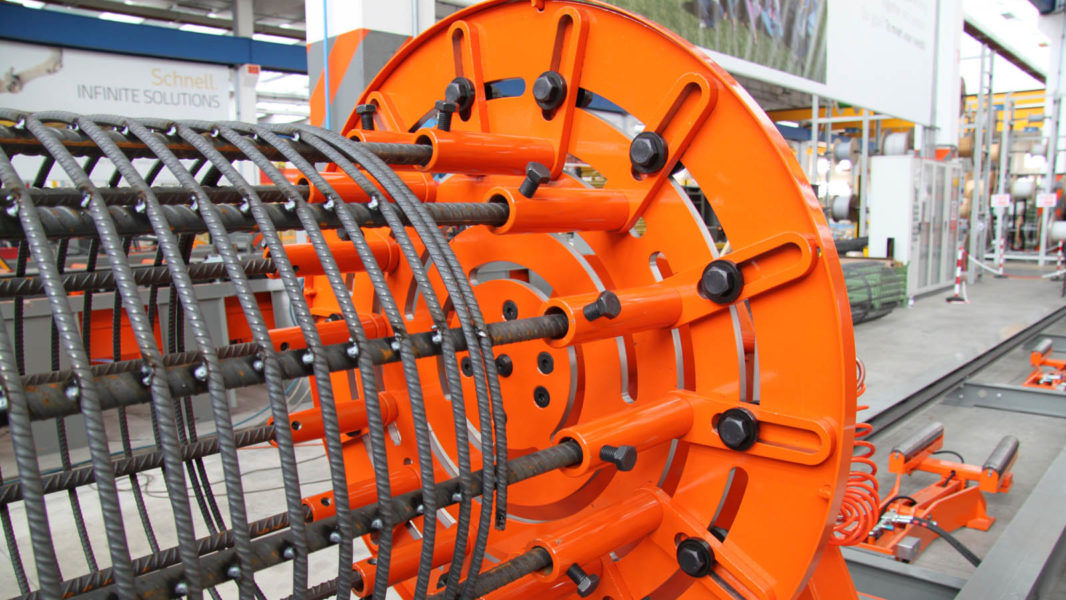 Pilotera para la producción de pilotes cilíndricos con espiral soldada y paso programable; máxima jaula realizable: Ø 1100 mm.