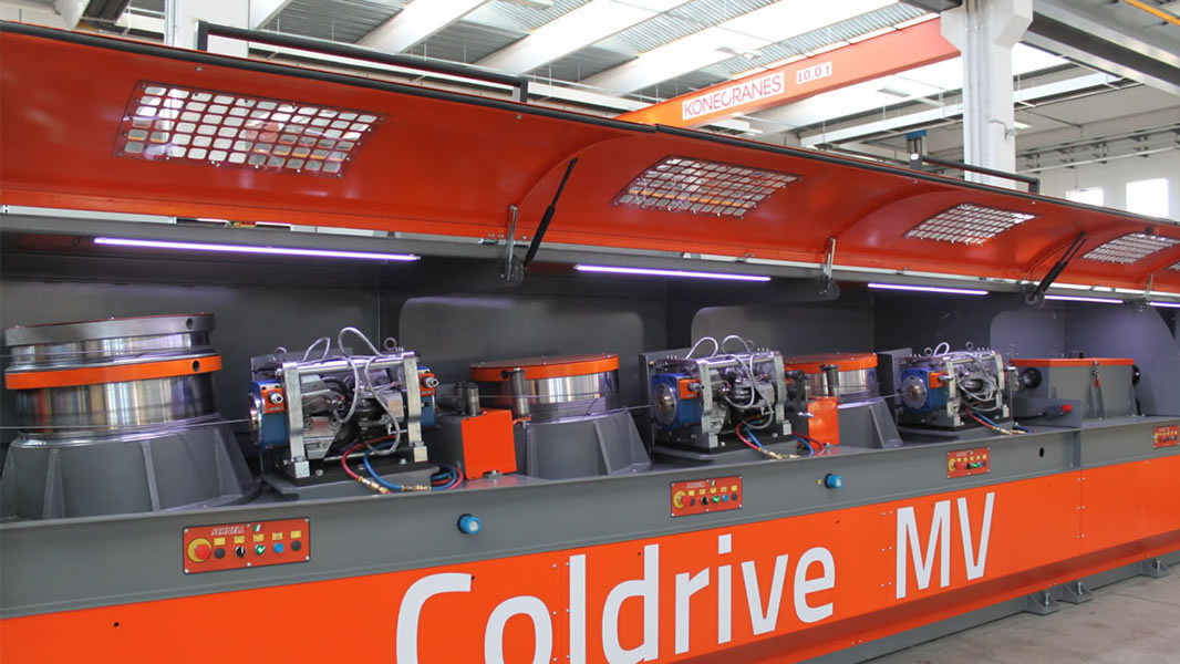 «Coldrive» 3MV es una línea de Laminación en frío con cabrestantes de tiro múltiples con bobinas individuales de eje vertical para la producción de alambre liso y corrugado de Ø 3,4 mm a Ø 8 mm. Esta planta es completamente modular y el proceso de laminación en frío es realizado a través cabrestantes de tiro y de cassettes de laminación/trefilado. Accionamiento mediante servomotores eléctricos digitales.