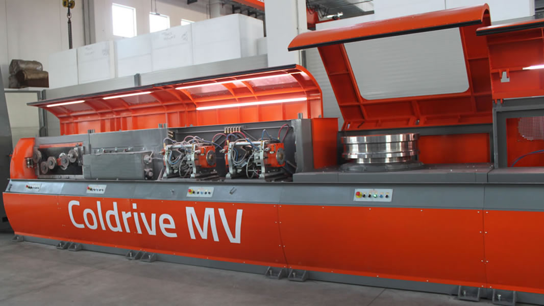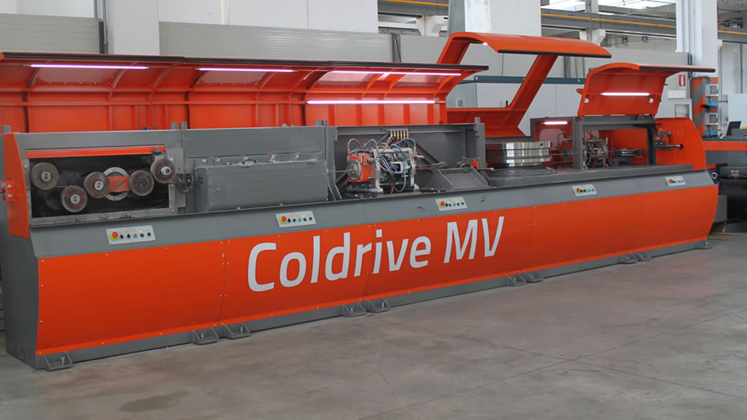 Coldrive MV es una línea de Laminación en Frío con cabrestante de tiro con bobina individual de eje vertical para la producción de alambre liso y corrugado de Ø 4 mm a Ø 12 mm. Esta planta es completamente modular y el proceso de laminación en frío es realizado a través cabrestantes de tiro y de cassettes de laminación/trefilado. Accionamiento mediante servomotores eléctricos digitales.