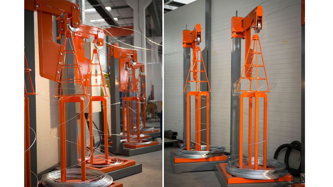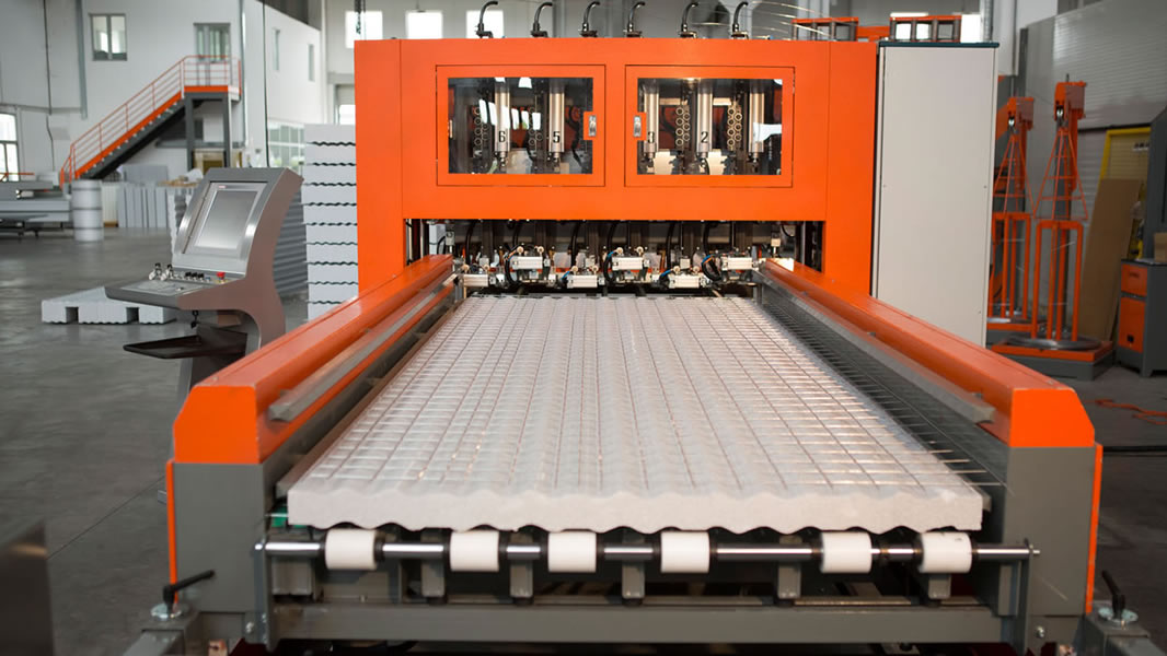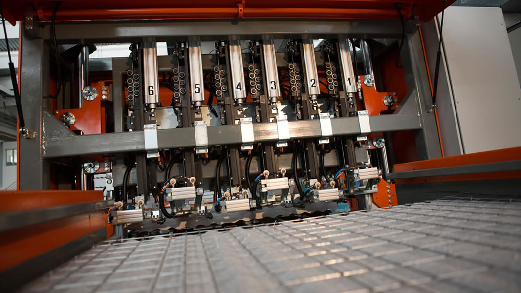 La máquina suelda los conectores verticales a las dos mallas externas, creando el panel sándwich.