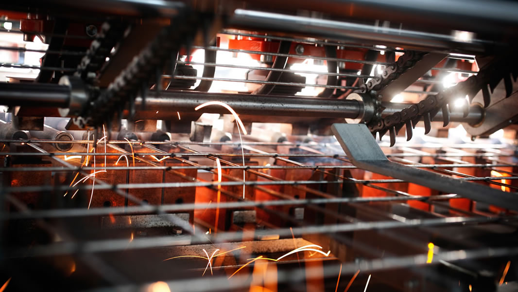 Maquina para la producción de malla electro-soldada alimentada por barras. Tal maquina produce mallas electro-soldadas a partir de hilos longitudinales y transversales previamente enderezados y cortados a medida con maquinas enderezadoras de hilo. La anchura máxima de la malla que se puede realizar es de 1250 mm, la longitud varia entre 2000 mm y 6000 mm.