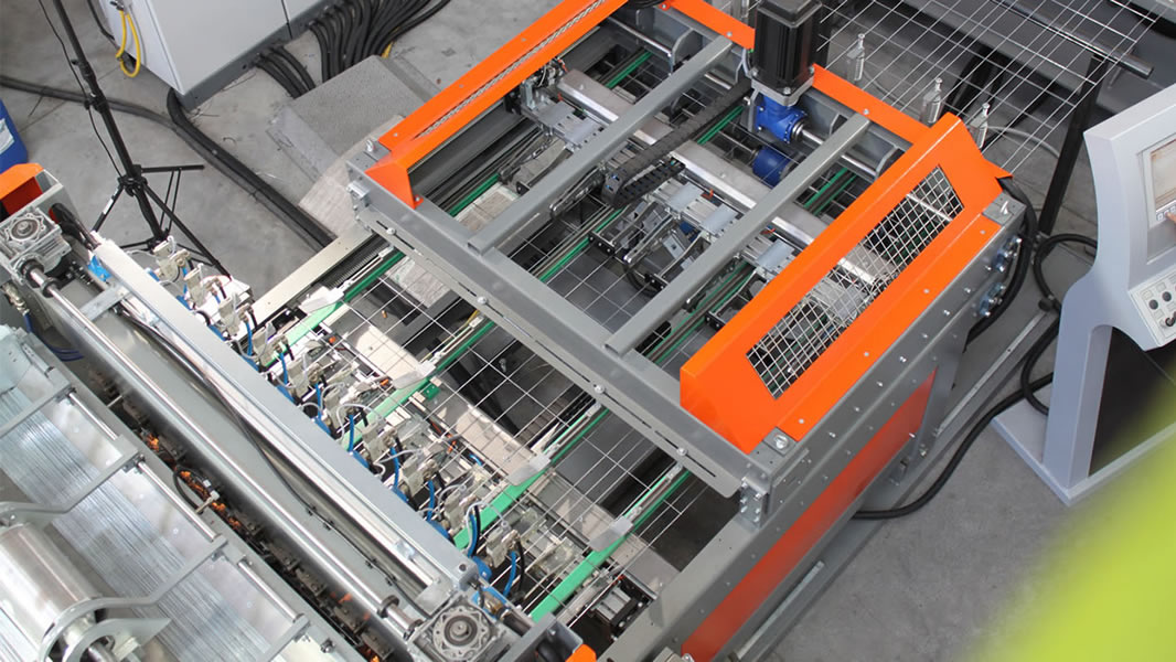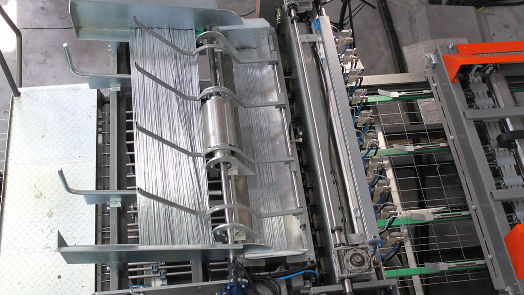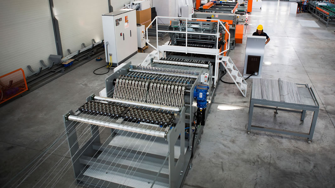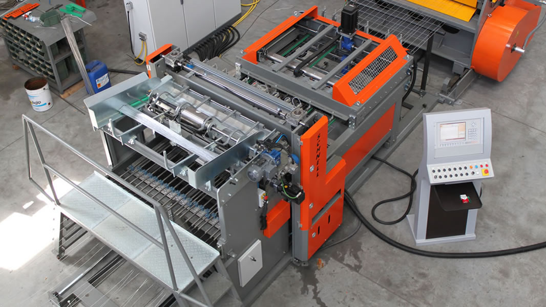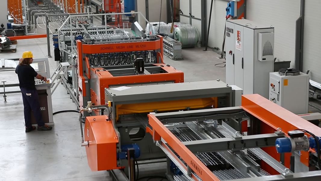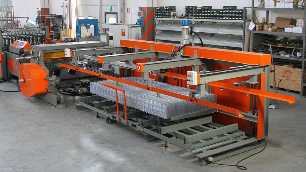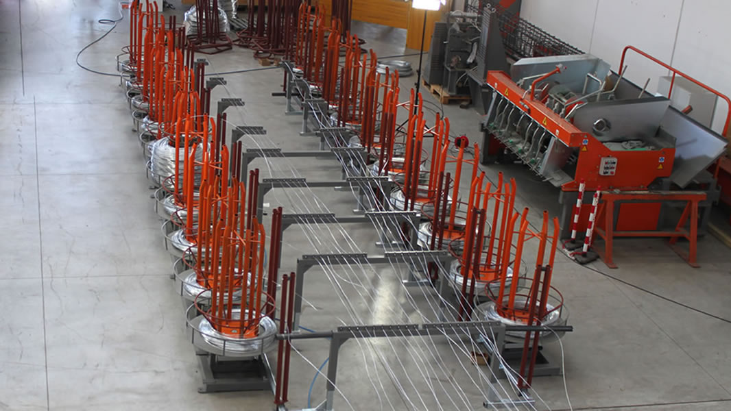 Maquina para la producción de malla electro-soldada alimentada por barras y coil. Tal maquina produce mallas electro-soldadas con hilos transversales previamente enderezados y cortados a medida con maquinas enderezadoras de hilo e hilos longitudinales suministrados directamente por la Coil. La anchura máxima de la malla que se puede realizar es de 1250 mm, mientras que la longitud no tiene límites.