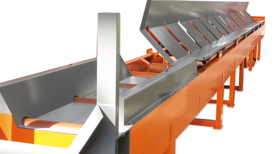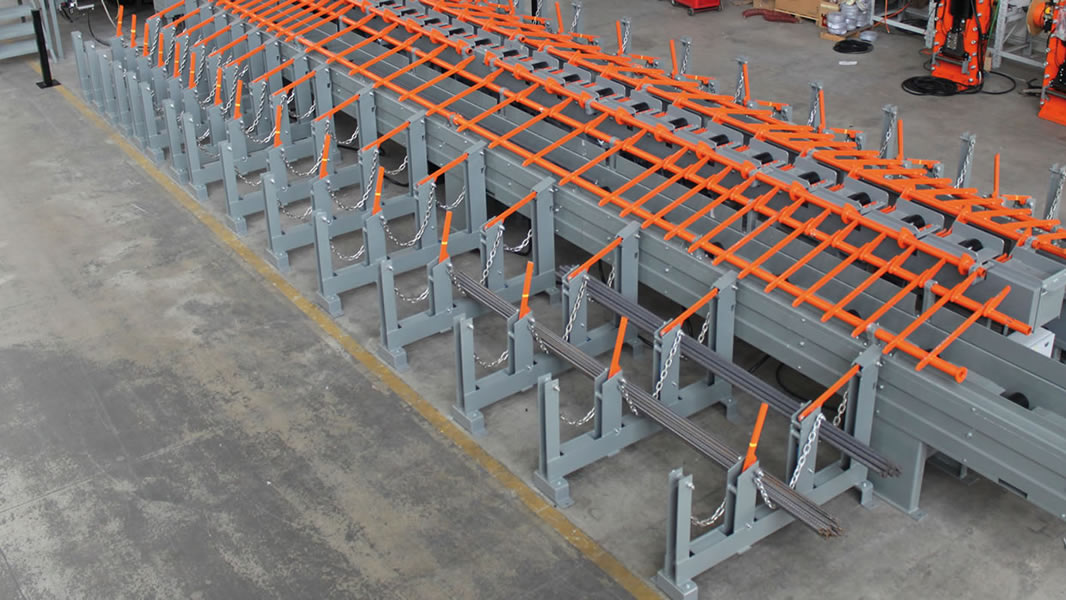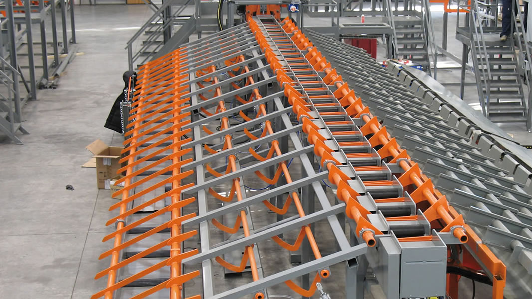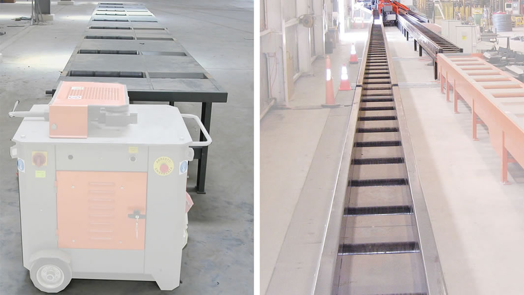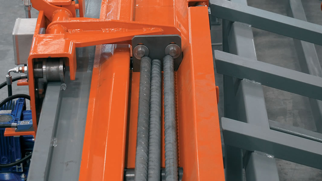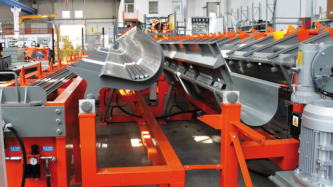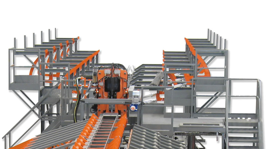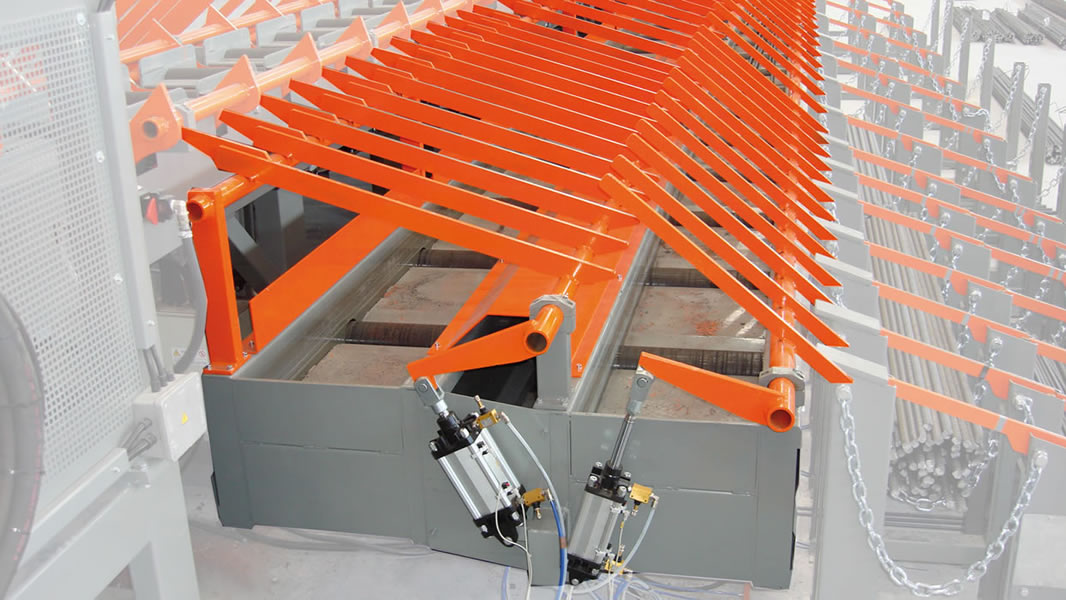 Planta integrada para el corte, la optimización y el almacenaje de las barras, idónea con cizalla CHV 160, montada sobre una armadura fija, con cuchilla de 160 mm, vía de medición y corte VBM1 con topes móviles, con descarga de un solo lado.